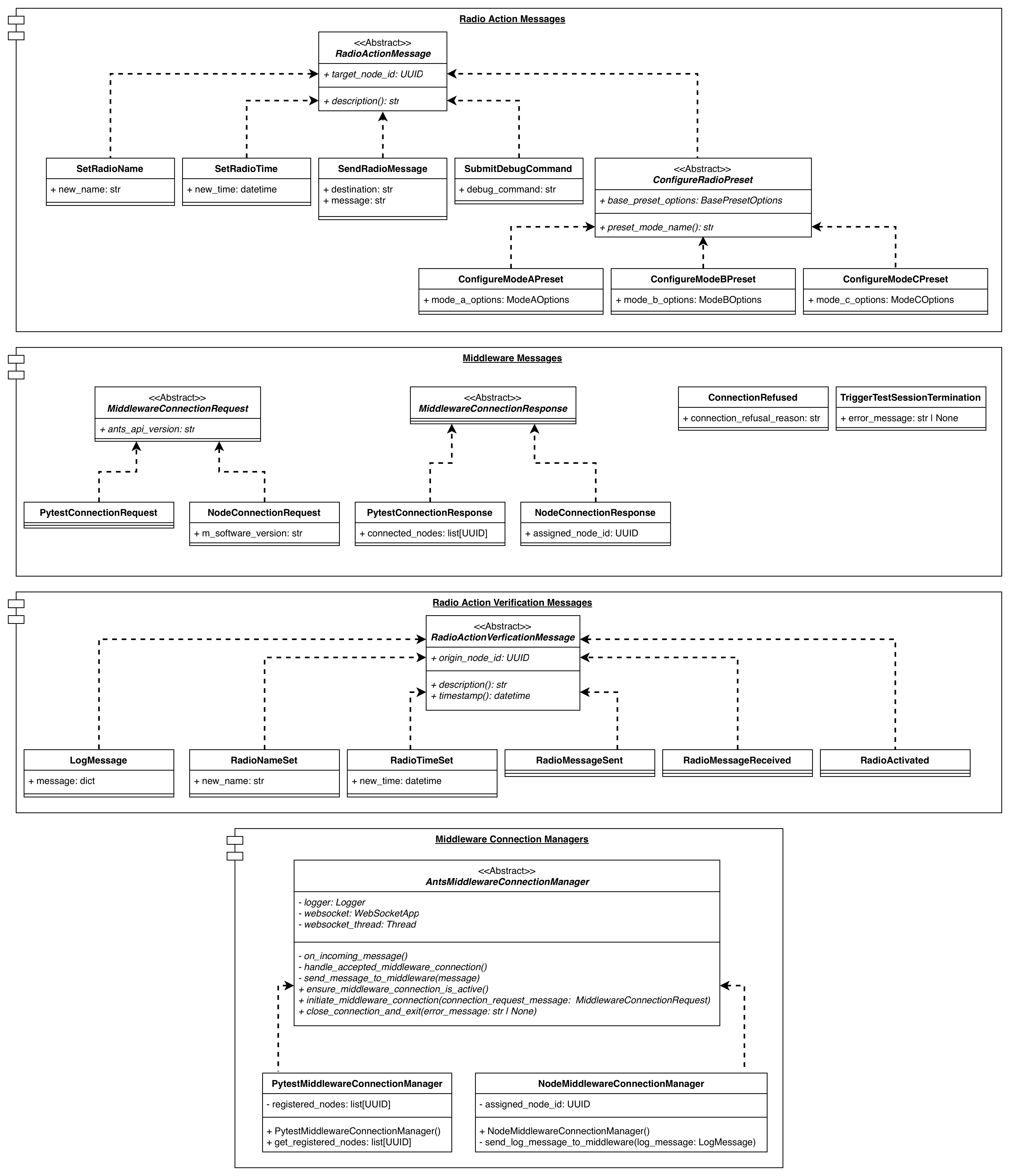 UML diagrams that illustrate the full scope of messages and objects contained within the ANTS API: