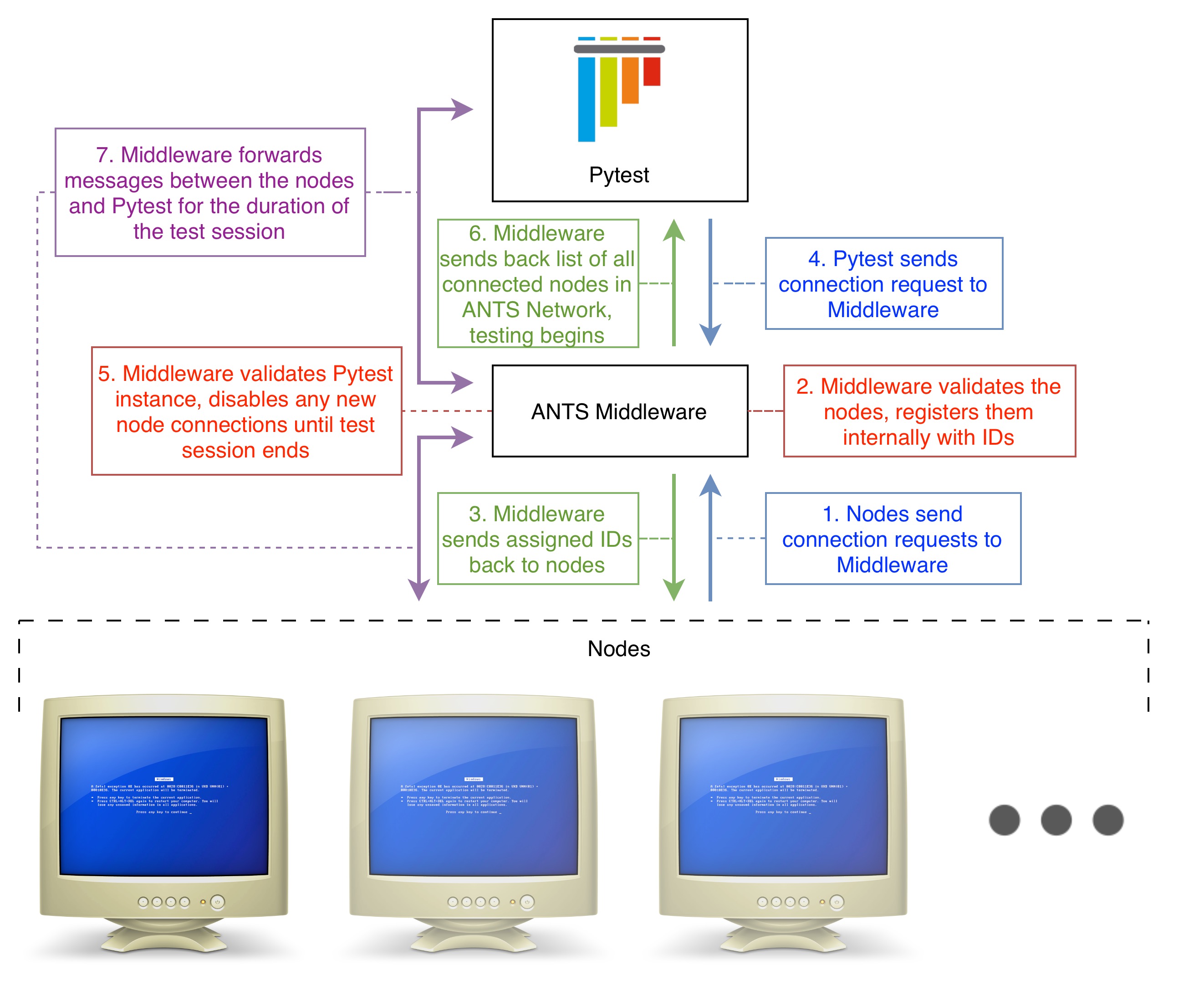 Sitting between these layers is a middleware application that coordinates all WebSocket connections within the ANTS Network, implements some additional logic relevant to testing, and forwards messages to their appropriate destinations.